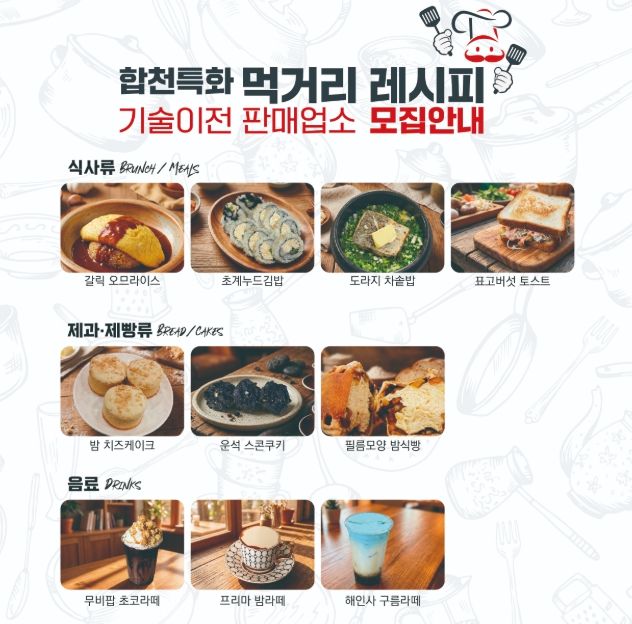 모집 대상은 합천군 내에 영업 신고가 된 일반음식점, 제과점, 휴게음식점 등이며, 기술이전을 통해 창업을 준비 중인 예비 창업자도 신청 가능하다.