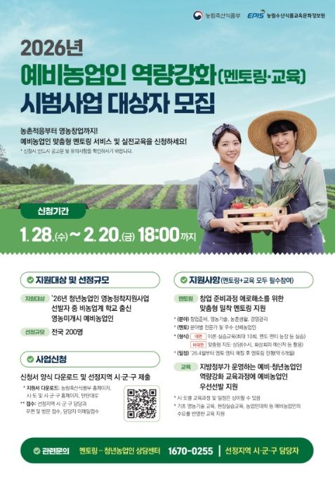 경상남도는 청년층의 농업 진입을 지원하기 위해 ‘예비농업인 역량강화 지원사업’을 2026년부터 신규 추진하고, 참여자를 모집한다고 밝혔다.