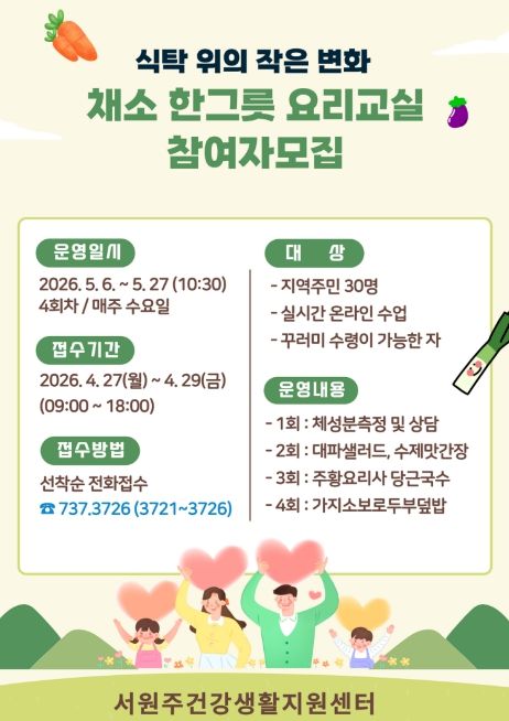서원주건강생활지원센터는 증가하는 만성질환에 대응하기 위한 ‘식탁 위의 작은 변화, 채소 한그릇 요리교실’ 프로그램 참여자를 모집한다.