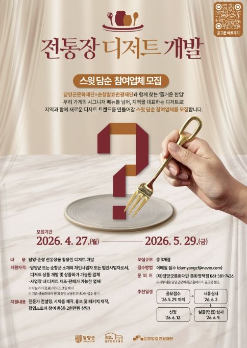 담양군문화재단이 순창발효관광재단과 함께 지역 전통장을 활용한 디저트 개발 프로젝트 ‘스윗 담순’ 참여업체를 모집한다.
