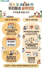 광주광역시 서구가 골목상권에 활력을 불어넣기 위해 ‘우리동네 골목맛집 100’ 발굴에 나선다. 서구는 지역 곳곳에 숨은 우수 음식점을 발굴해 대표 맛집 브랜드로 육성하고 있으며 현재 84개소가 골목맛집으로 운영 중이다. 올해는 서구 관내 소규모 음식점과 제과점을 대상으로 진행되며 서류 심사와 현장 조사, 온라인 주민 투표, 전문가 심의를 거쳐 위생·맛·서비스·향토성 등을 종합 평가해 최종 16개소 내외를 선정할 계획이다. 신청 자격은 공고일 기준 서구 내에서 영업신고 후 1년 이상 운영 중인 연면적 150㎡ 이하의 소규모 음식점과 제과점이다. 단, 프랜차이즈 가맹점·직영점, 단란·유흥주점은 제외되며 최근 1년 이내 행정처분 이력이 없어야 한다. 선정된 업소에는 ▲공식 지정패 교부 ▲전문가 경영 컨설팅 ▲SNS 홍보 콘텐츠 제작 등 맞춤형 지원을 제공된다. 특히 올해는 식품의약품안전처 위생등급제 지정을 위한 주방 위생 컨설팅을 강화하고 위생 분야 환경개선사업 신청 시 우선권을 부여하는 등 지원을 확대할 계획이다. 신청 기간은 오는 20일까지이며 참여를 희망하는 업소는 서구보건소 보건위생과를 방문하거나 등기우편 또는 전자우편으로 신청하면 된다. 자세한 사항은 서