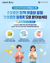 소상공인 정책 정보가 도착했습니다. 소상공인 정책 맞춤형 알림 '소상공인 알림톡'으로 받아보세요. ■ 맞춤형 정책 알림 서비스 소상공인의 업종·지역·사업 이력 등을 분석해 필요한 지원사업 정보를 문자·카카오톡으로 맞춤 안내 - 소상공인 DB 기반 약 134만 데이터 활용 - 맞춤형 정책 안내 대상별 지원사업 추천 - 문자·카카오톡 알림 소상공인24 가입자 대상 ※ 소상공인24 정책정보 수신 동의자 대상