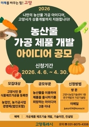 고양특례시는 농업인의 참신한 아이디어를 반영한 가공 제품을 발굴하고자 ‘2026년 농산물 가공 제품개발 아이디어 공모’를 실시한다. 이번 공모는 고양시에 식품 제조‧가공업을 등록한 농업인 또는 농업경영체를 대상으로 한다. 접수는 4월 6일부터 30일까지 고양시농업기술센터 방문이나 이메일을 통해서 가능하다. 제출된 공모안은 1차로 자격요건 확인 등을 위한 농가 현장조사가 이뤄진다. 이후 생산성, 상품성, 표준화, 사업성 등 4개 항목에 대한 2차 서면심사를 진행한다. 최종 선정된 아이디어는 전문가 컨설팅을 통해 가공제품 개발로 이어지며 농업인에게 기술을 이전해 상품화까지 지원할 예정이다. 고양시농업기술센터 관계자는 “이번 공모를 통해 지역 농산물을 활용해 창의적인 가공제품 아이디어를 발굴하고, 농가의 가공 관련 창업 경쟁력을 높이는 계기가 되길 기대한다”며 “앞으로도 농업인의 가공기술 역량 강화를 위한 지원을 지속하겠다”고 말했다.