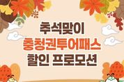 충청광역연합(연합장 김영환)은 민족 대명절 추석을 맞아 충청권 대표 관광상품 ‘충청권투어패스’의 특별 할인 프로모션을 진행한다고 밝혔다. 충청권투어패스는 대전·세종·충북·충남 4개 시·도의 주요 관광지를 하나의 패스로 편리하게 즐길 수 있는 통합 이용권이다. 평상시에도 관광지 정상 요금 대비 약 50% 저렴하게 이용할 수 있는 합리적인 관광상품이면서 전체 가맹점 중 이용객이 원하는 관광지를 자유롭게 선택할 수 있는 장점이 있다. 이번 프로모션에서는 충청권투어패스 ‘빅2(2곳 이용권)’ 상품을 정상가 29,900원에서 2만원 할인된 9,900원에 제공한다. 판매 수량은 총 3천 매 한정이며, 9월 26일부터 10월 12일까지 네이버 스마트스토어를 통해 구매할 수 있다. 사용 기한은 10월 31일까지다. 한편, 충청광역연합은 충청권투어패스의 상품 경쟁력 강화를 위해 관광지나 체험시설 뿐 아니라 식음료 업종(카페 등)까지 신규 가맹점 모집을 확대하고 있다. 가맹점으로 등록하면 투어패스 공식 채널 홍보와 주요 온라인 판매망 연계 등 다양한 혜택을 누릴 수 있어 관광객 유입 효과가 기대된다. 충청광역연합 관계자는 “추석 연휴 기간 가족과 함께 충청권의 다양한 관광지를