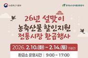■ 2026년 설맞이 농축산물 할인지원 전통시장 환급행사 - 2026.2.10.(화)~2.14.(토) (5일간) - 환급소 운영시간 9:00~17:00 ※ 운영시간은 시장상황에 따라 변경될 수 있음 · 행사기간 내, 1인 2만 원 한도 행사기간 내 구매 영수증 금액 합산 가능/ 추가, 중복 수령 불가 - 3만 4000원 이상 구매 시 온누리 상품권 1만 원 환급 - 6만 7000원 이상 구매 시 온누리 상품권 2만 원 환급 예산 소진 또는 부정환급 적발 시 조기종료 ■ 환급절차 ① 국내산 신선 농축산물 구매 후 영수증 수령 ② 점포주가 농축산물 환급 앱에 판매 정보 입력 ③ 구매 영수증, 본인확인 수단(휴대전화) 지참 후, 환급소 방문 ④ 구매한 영수증 및 본인확인 후 상품권 수령 ■ 행사대상 참여 점포에서 국산 신선 농축산물 구매한 고객 ■ 불가항목 · 본인확인 수단(휴대전화) 미지참 시 환급불가 · 국산 신선 농축산물이 아닌 품목 · 행사 미등록 점포 구매 영수증 · 재발행 영수증, 간이 영수증 환급 · 행사 기간 내 구매가 아닌 영수증 · 구매 고객이 아닌 대리인(ex. 구매는 본인이 했으나 지인이 대신 환급 받는 경우) ■ 문의전화: 02-6956-2